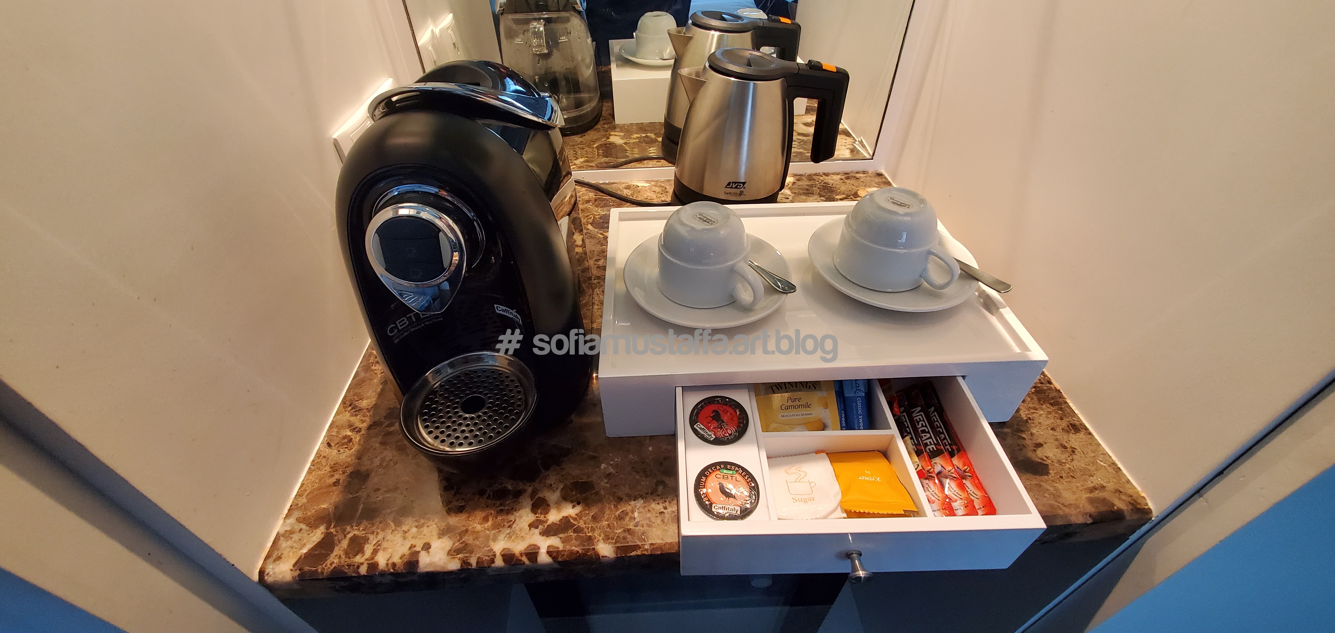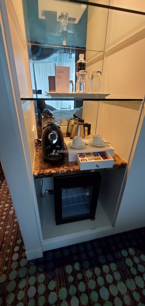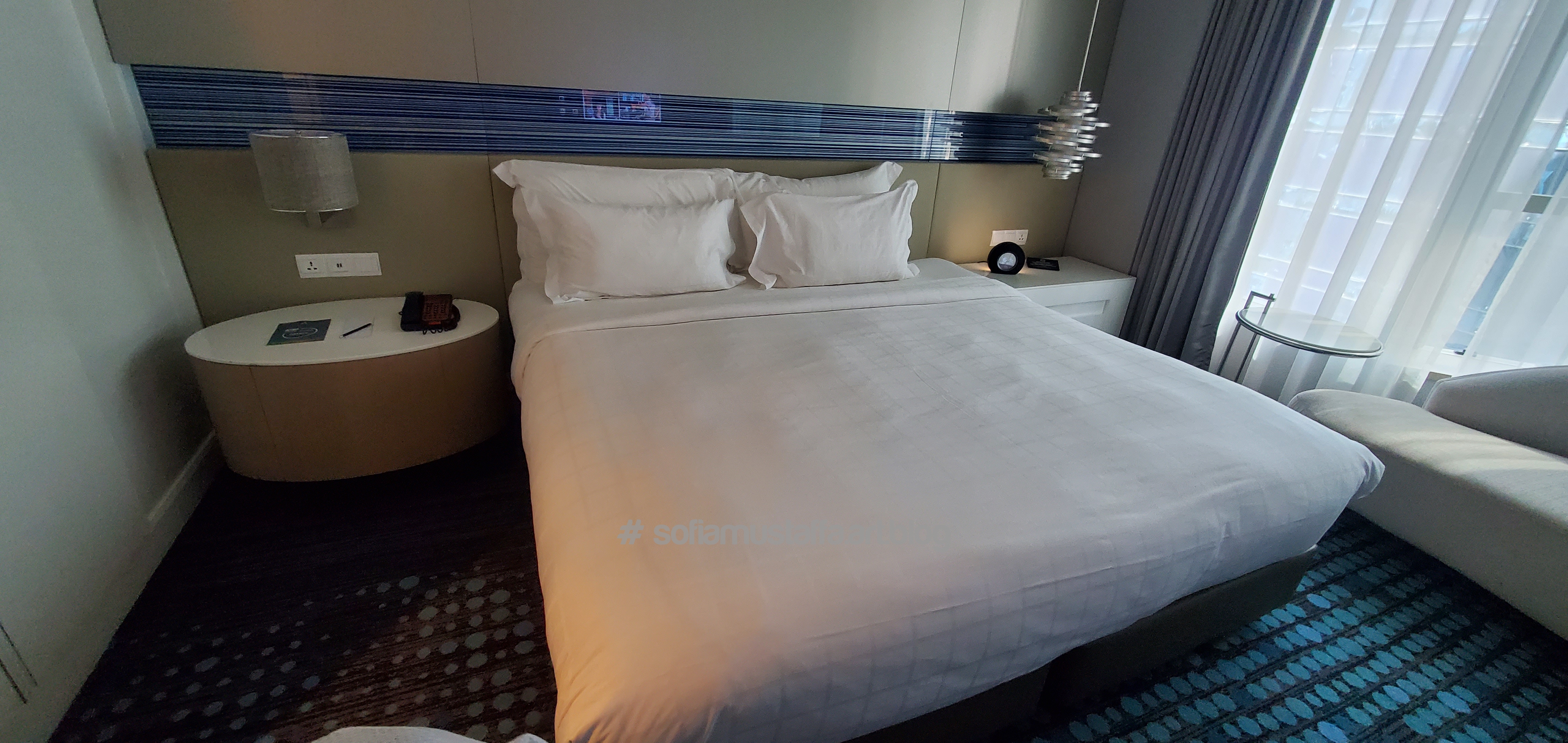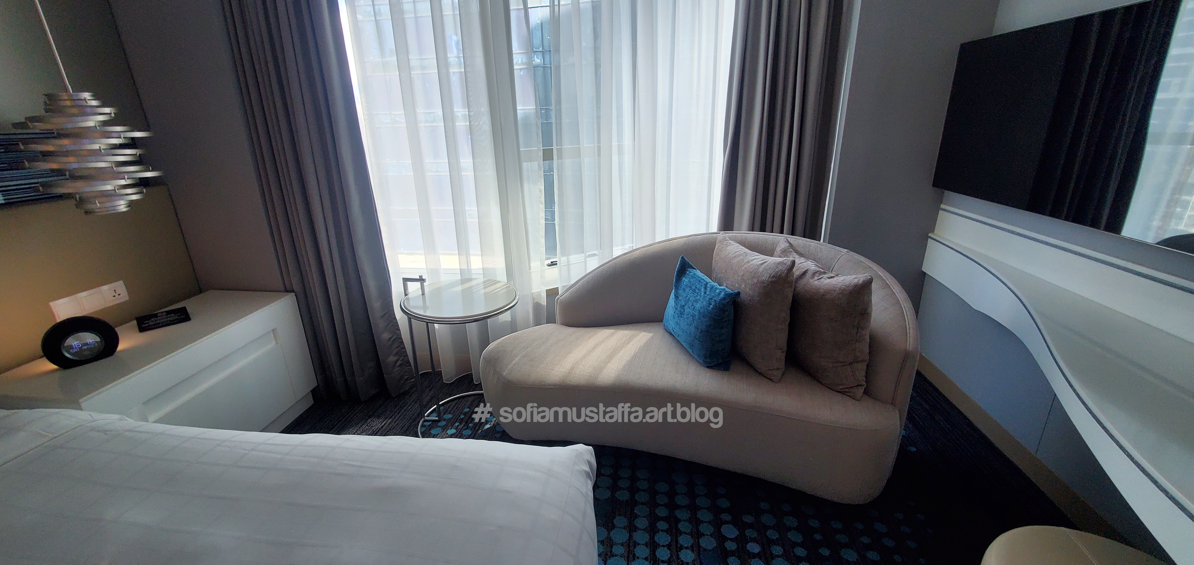 The entire roomThe couch…love the design. Very comfortable at right level of height. 🥰The bed is very thick. Not soo fluffy, but still okay. Its feather fill pillow. They put on bed topper, but I think I will love the original mattress more coz the texture was like a bit latex feelings. The bed topper was like a normal foam to me. But still okay, not bad.It got side table, plenty of switch and lights, service phone, minibar fridge, coffee machine, mineral etcHere got only coffee and tea, if you need chocolate, u need to order in-room service..or simply bring your own..or..you can order Grabfood 😃Coffee and tea available..with creamer and sugarAvailable, hair dryer, rechargable torch light, iron and board. Its very thoughtful to have the torch light, in case if there is an emergency blackout happen.Nice..