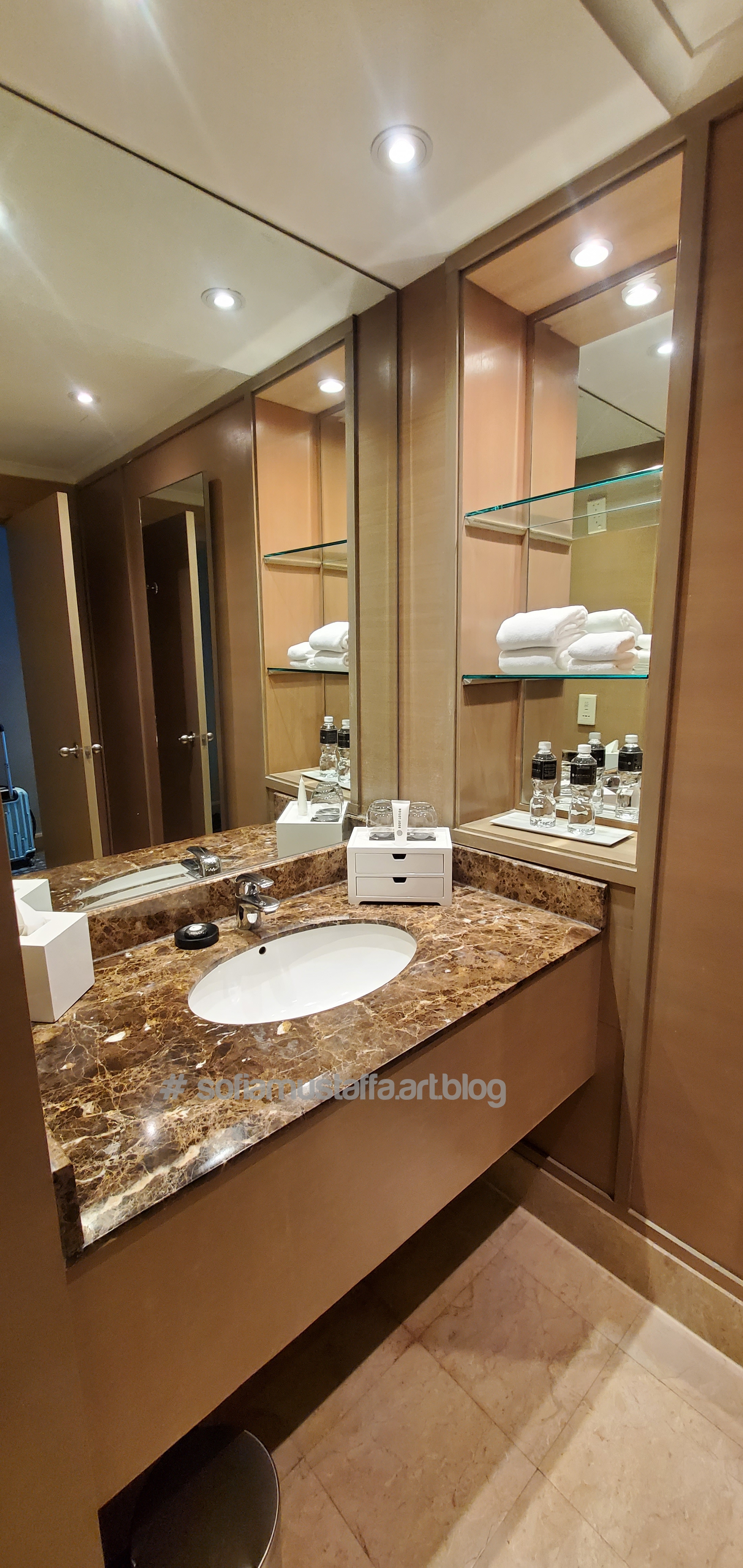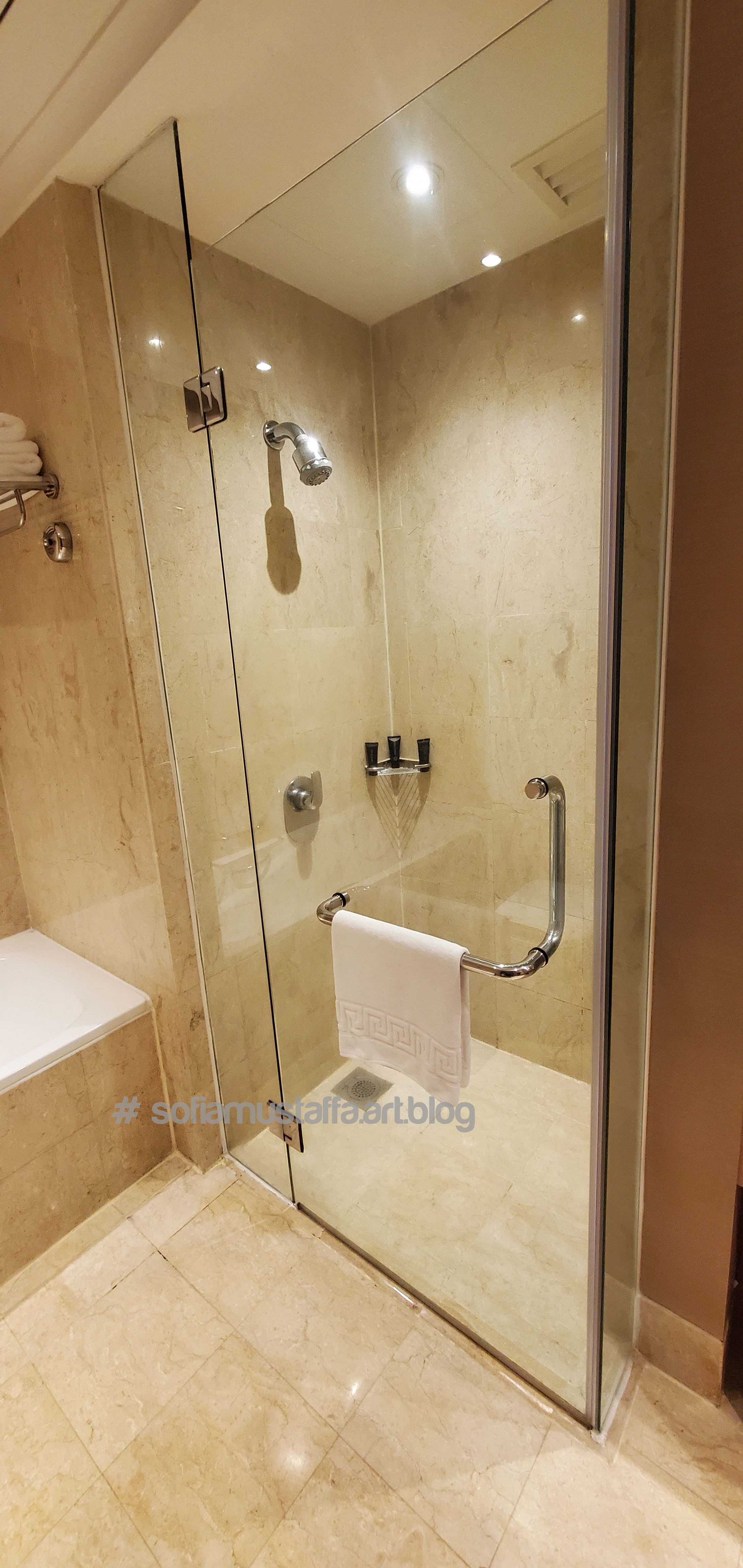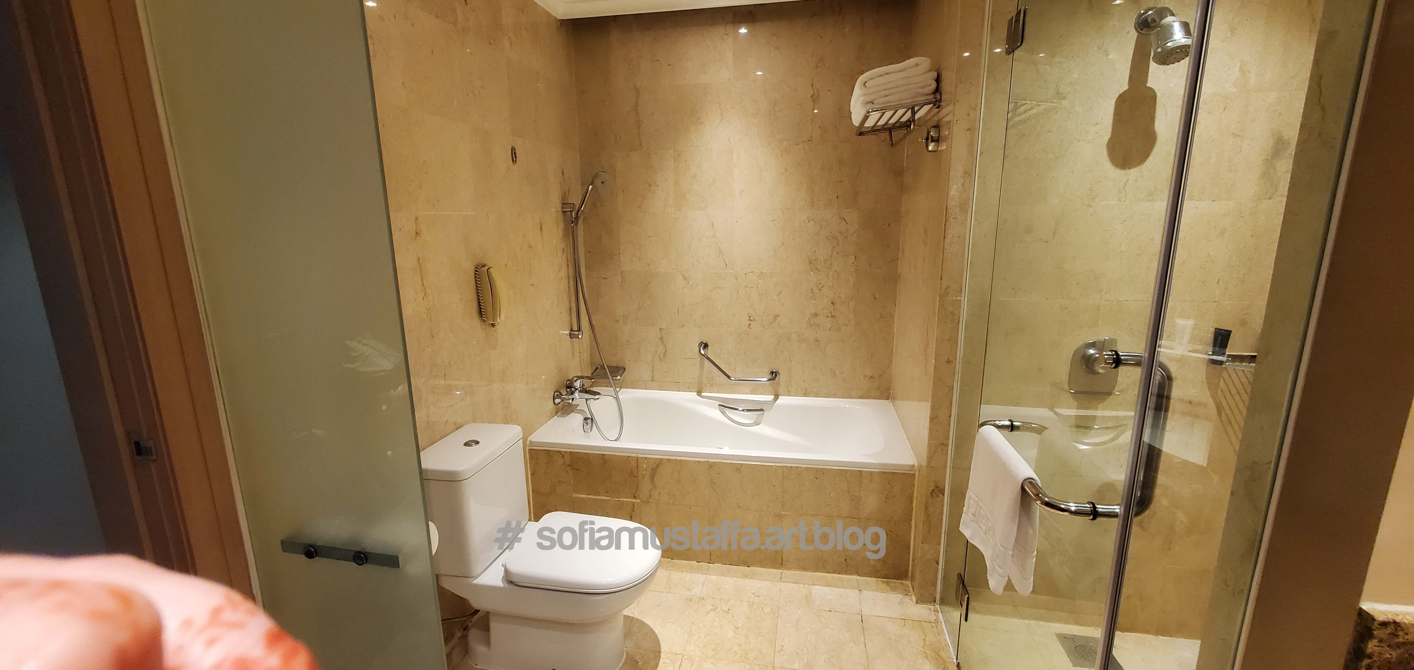 The hotel bathroom is kinda spacious..but the concept kinda similar to Pullman hotel. The bathroom has partition to divide the shower, and bowl, and each of the rooms has bath tub 🥰
